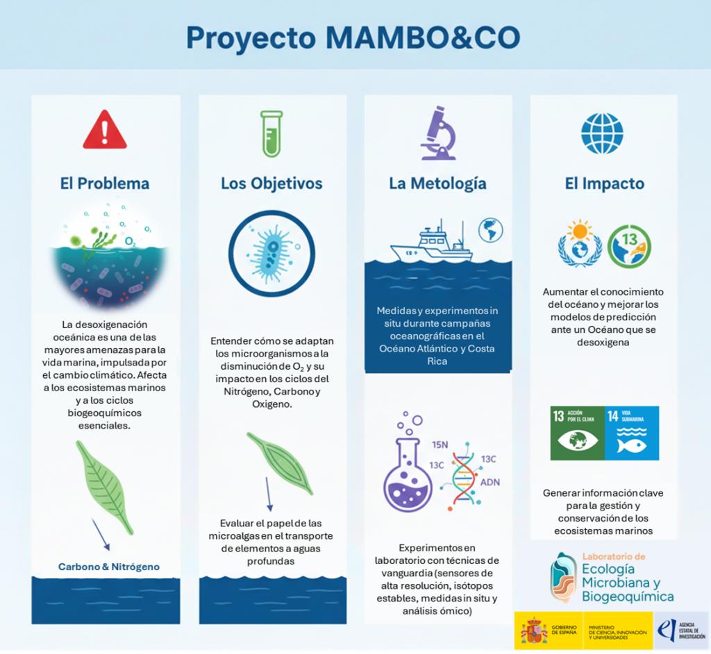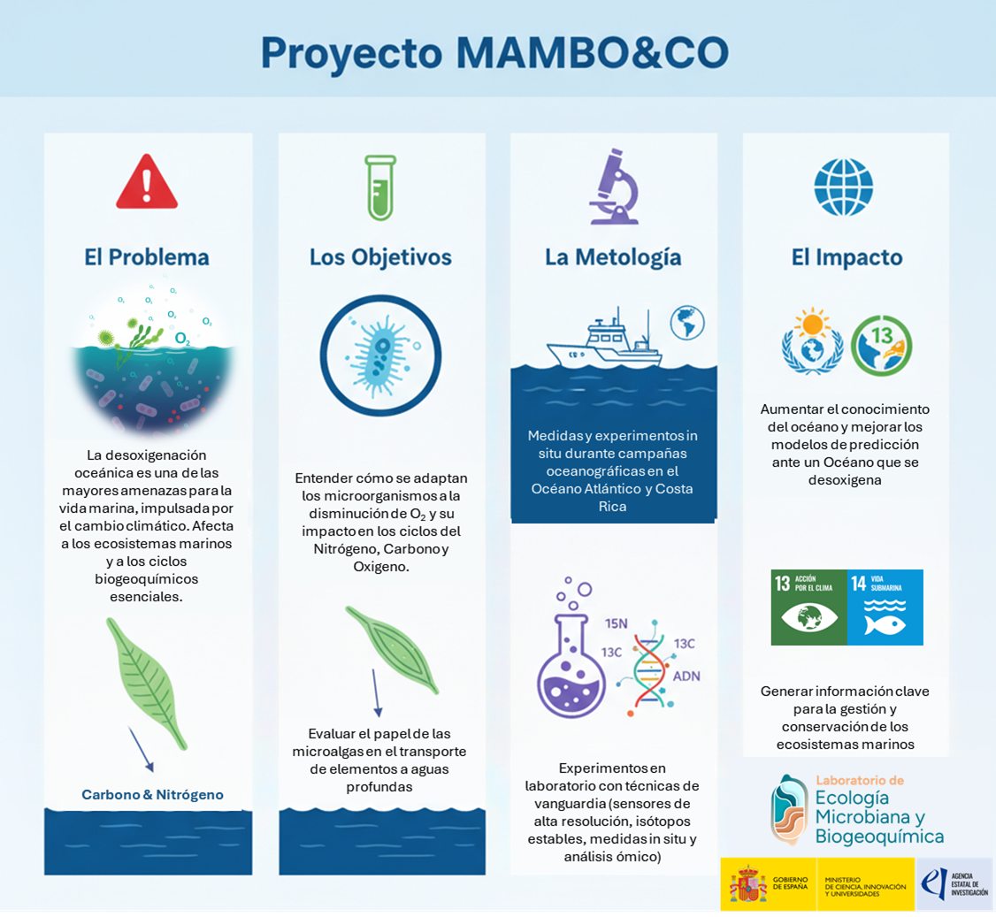 MAMBO&CO, acrónimo de Metabolismo MicroBiano en la frontera óxica-anóxica: interacción de los ciclos del Carbono, el Oxígeno y el nitrógeno, es un proyecto de investigación que busca entender cómo las comunidades microbianas y de fitoplancton se adaptan a la disminución de oxígeno en los océanos. El objetivo es proporcionar información esencial para comprender la desoxigenación oceánica y predecir las respuestas del medio ambiente al cambio climático.