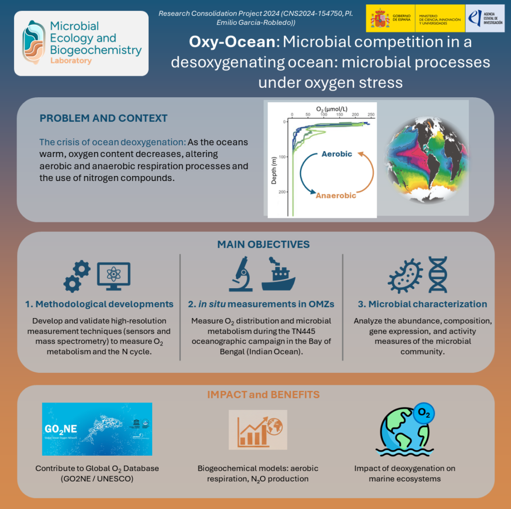 The Oxy-Ocean project (Microbial competition in a deoxygenating ocean: microbial processes under oxy-stress) addresses a critical challenge in modern oceanography: the increasing ocean deoxygenation and its impact on the global carbon and nitrogen cycles, as well as on climate. Led by Principal Investigator (PI) Emilio G. Garcia Robledo, this project seeks to understand how marine microbial communities manage the transition from aerobic to anaerobic processes in very low-oxygen environments, such as Oxygen Minimum Zones (OMZs).